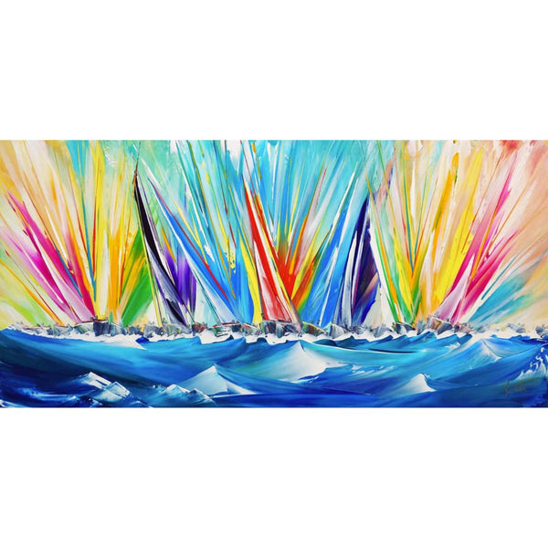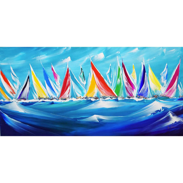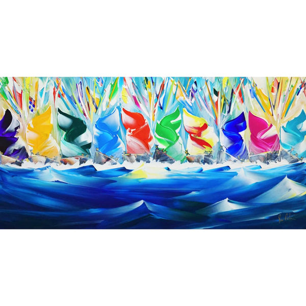 Jan’s paintings are as much about the paint as the picture – the paint is laid on thickly so that it catches the light and adds extra depth. This style of painting helps to capture the tremendous movement, thrills and glorious colours of sailing, both in a scenic and racing sense.