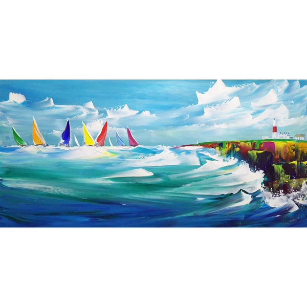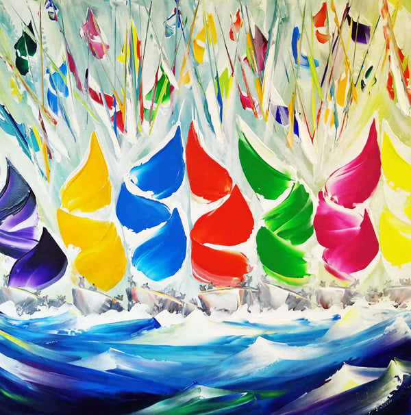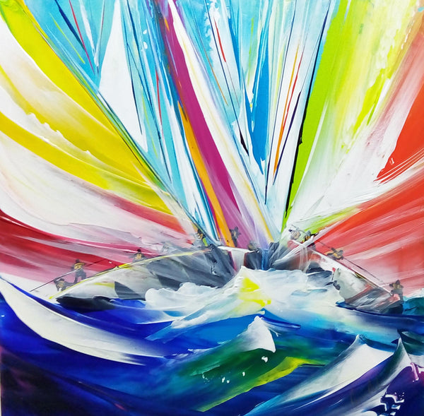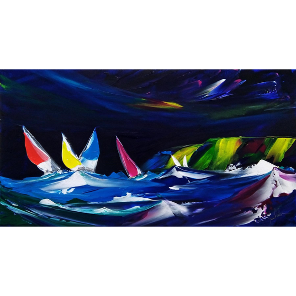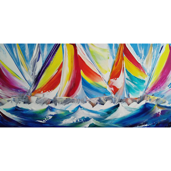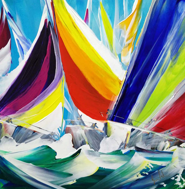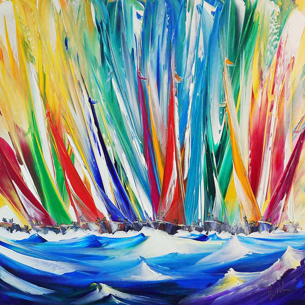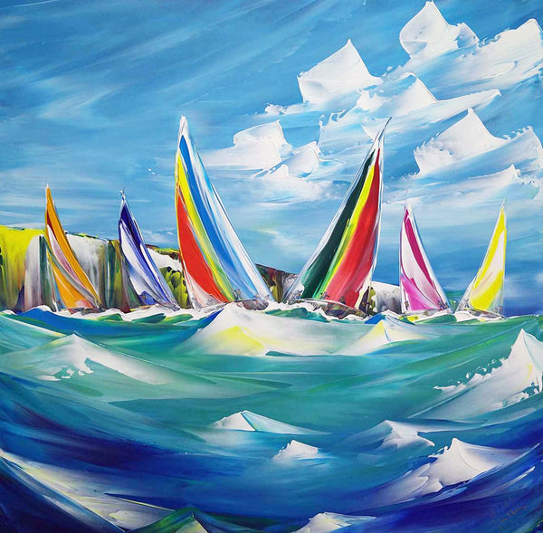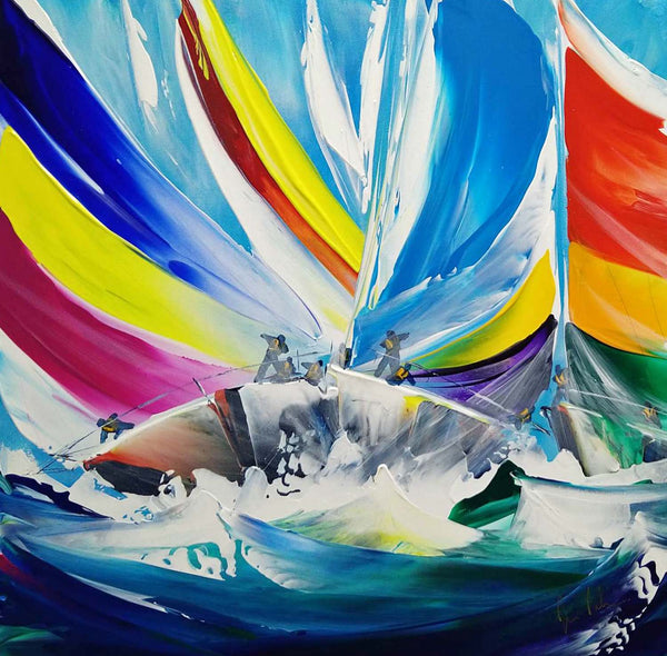 Jan’s paintings are as much about the paint as the picture – the paint is laid on thickly so that it catches the light and adds extra depth. This style of painting helps to capture the tremendous movement, thrills and glorious colours of sailing, both in a scenic and racing sense.