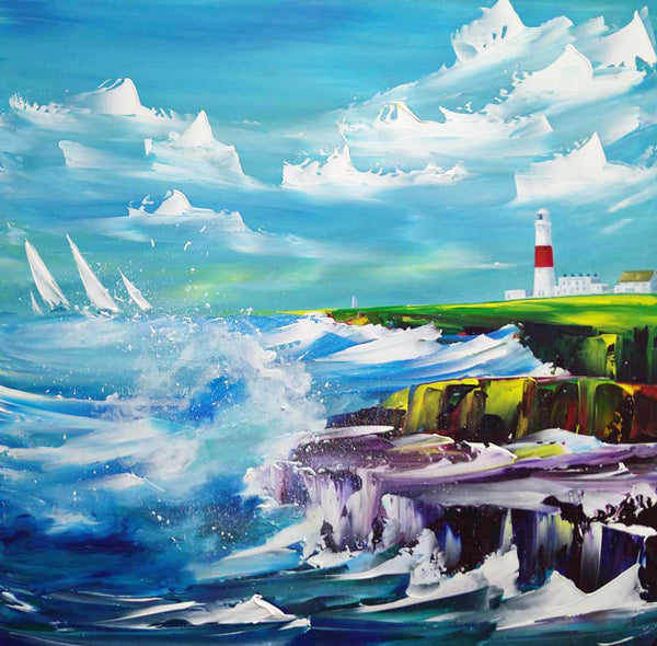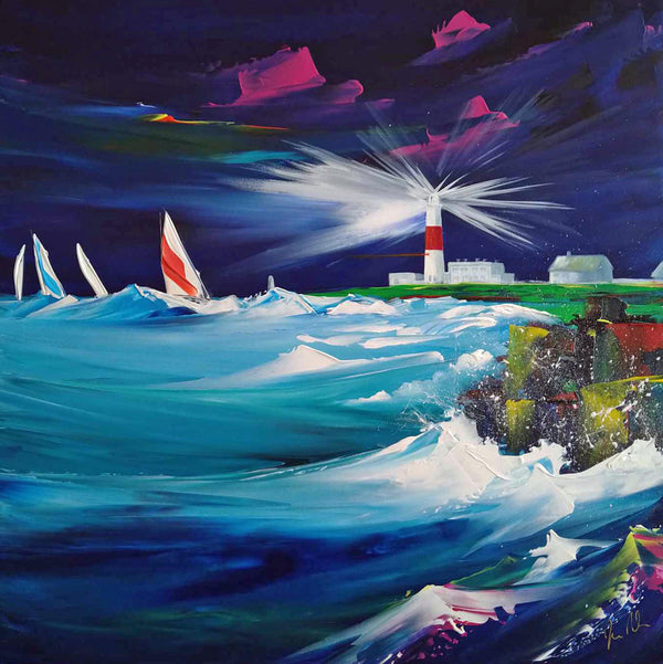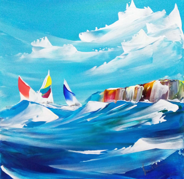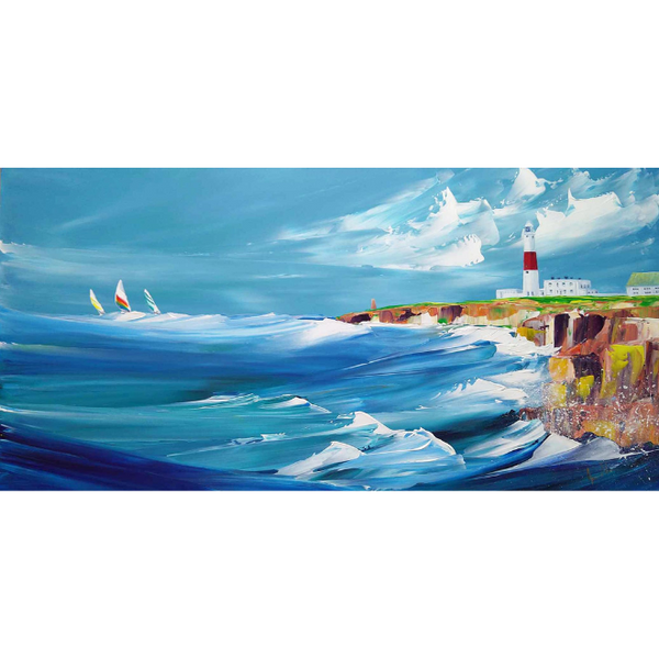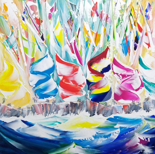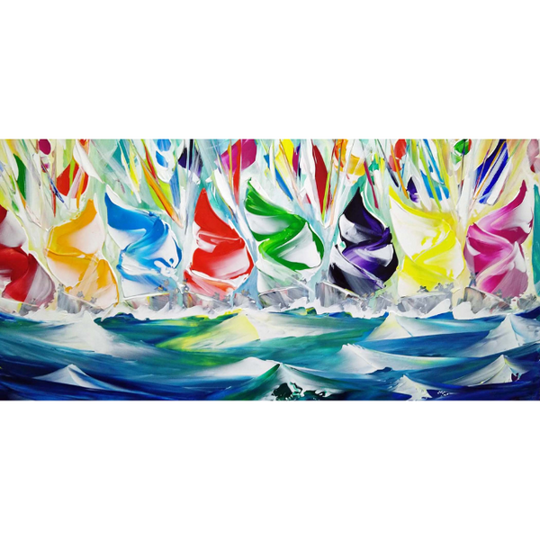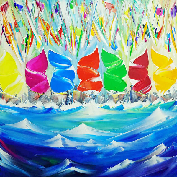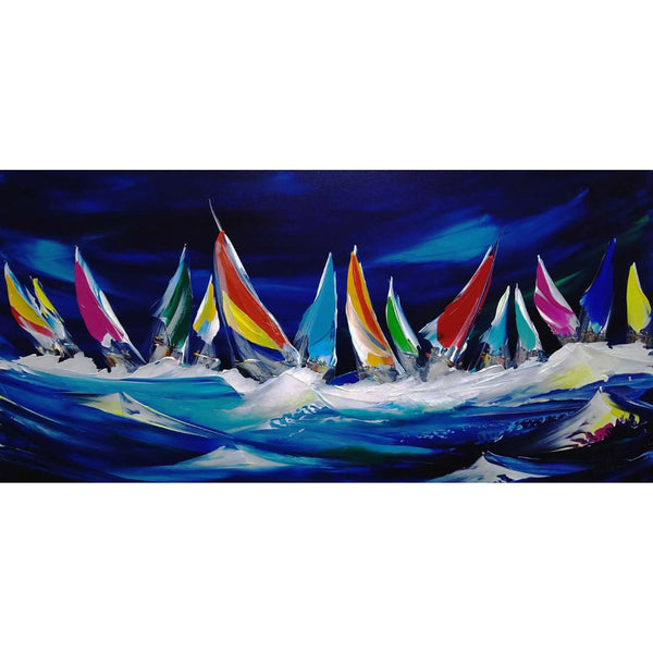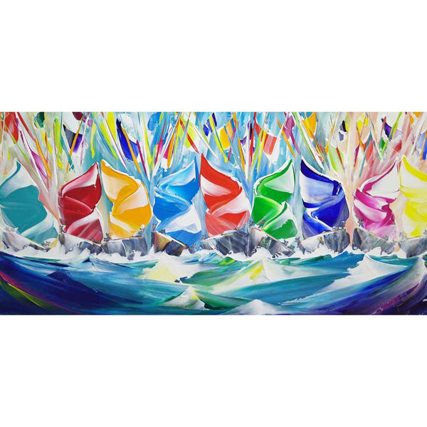 Jan’s paintings are as much about the paint as the picture – the paint is laid on thickly so that it catches the light and adds extra depth. This style of painting helps to capture the tremendous movement, thrills and glorious colours of sailing, both in a scenic and racing sense.