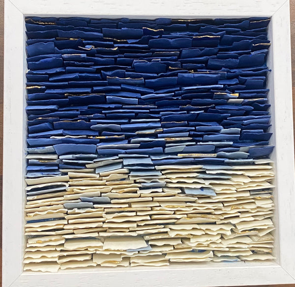 With her passion for ceramics Julie embarked on a MA Ceramics at UCA Farnham, which she completed in 2016. Julie specializes in wall art created from stained shards of porcelain clay with an emphasis in creating tactile edges. The range of colours and tones are created by staining the body of clay. The clay is then dried, rolled, cut to size and fired in the kiln to 1260 degrees. After firing the porcelain clay the pieces are then mounted individually into their frames.