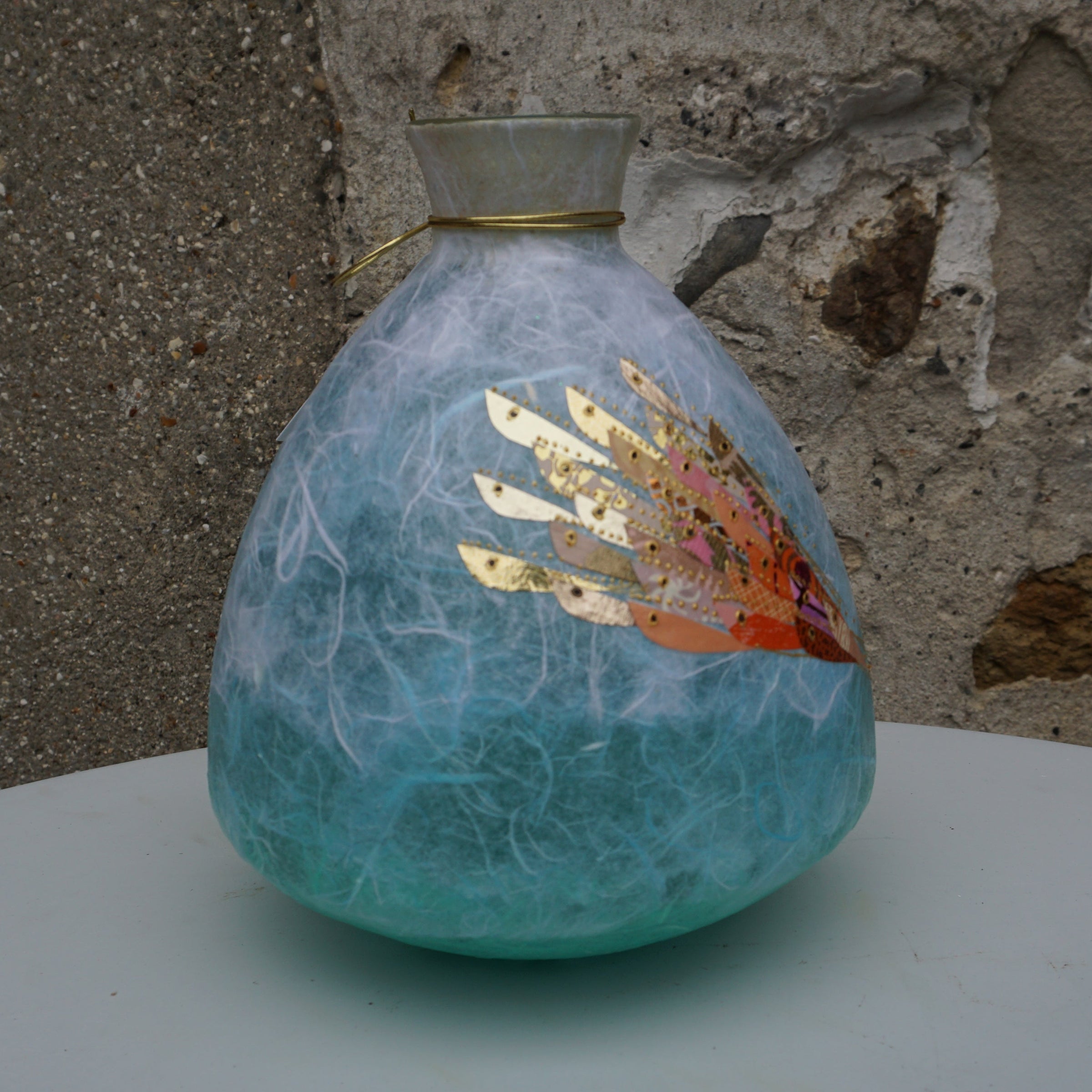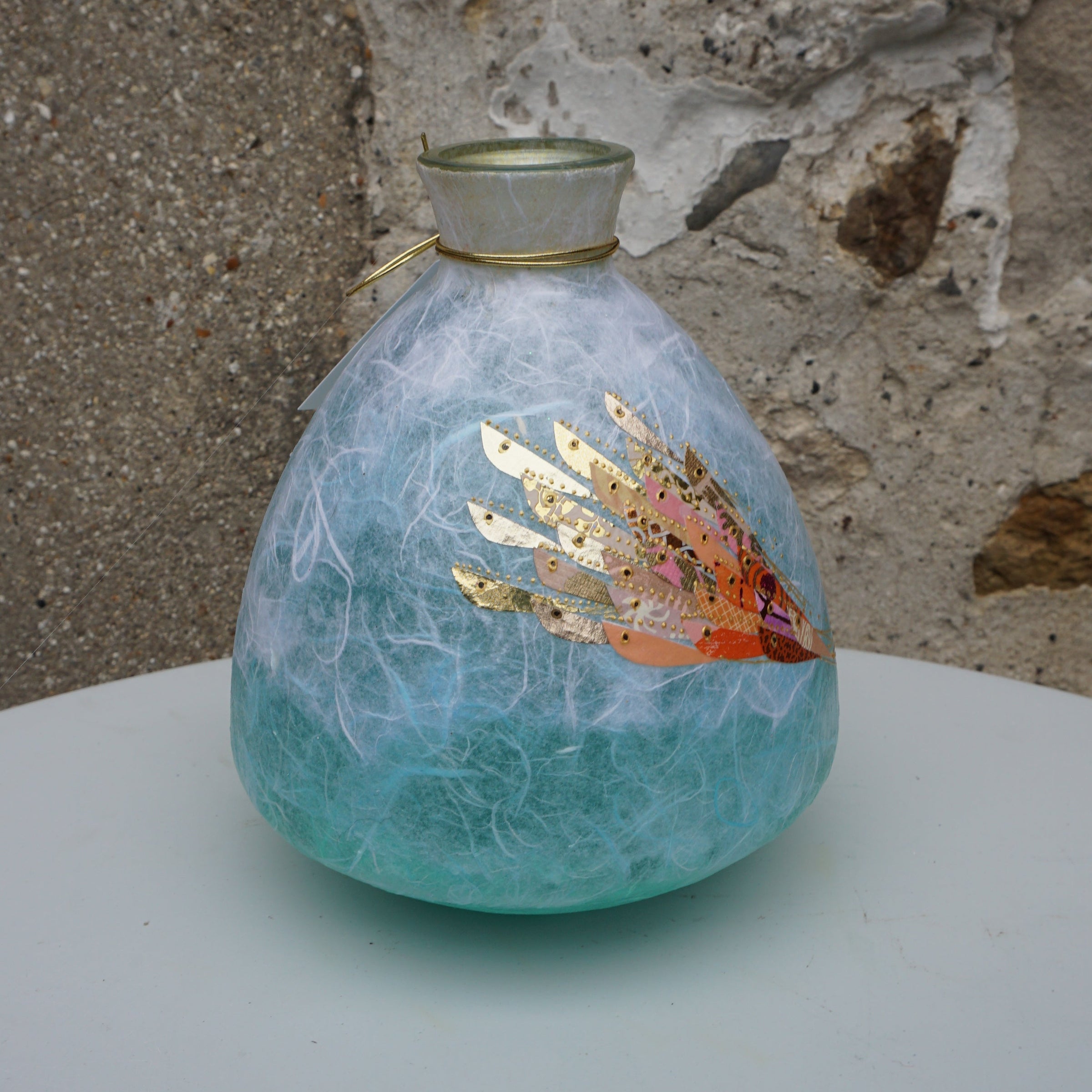 Hand decorated glass vase using Silk Paper and foils.