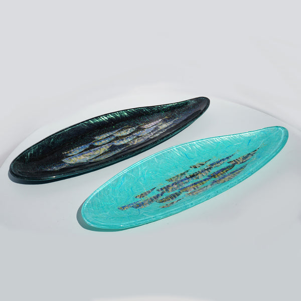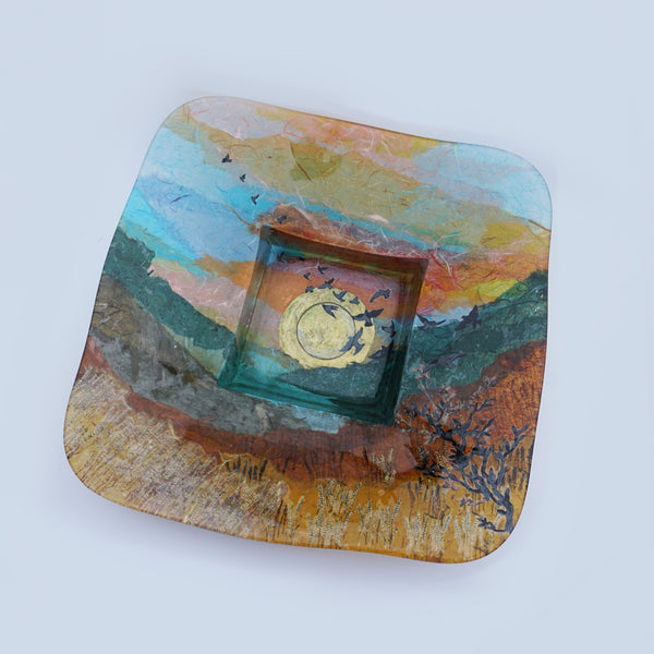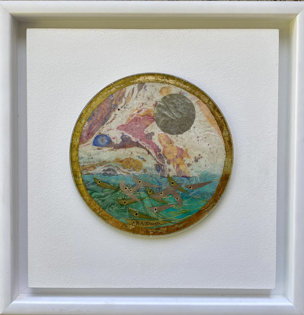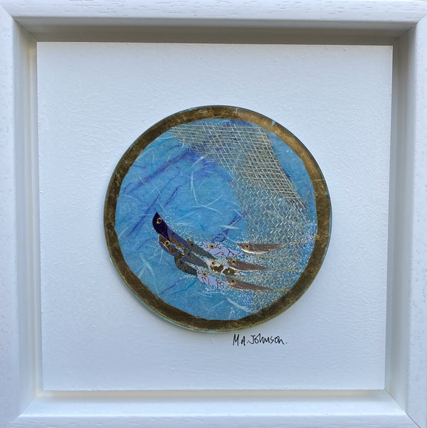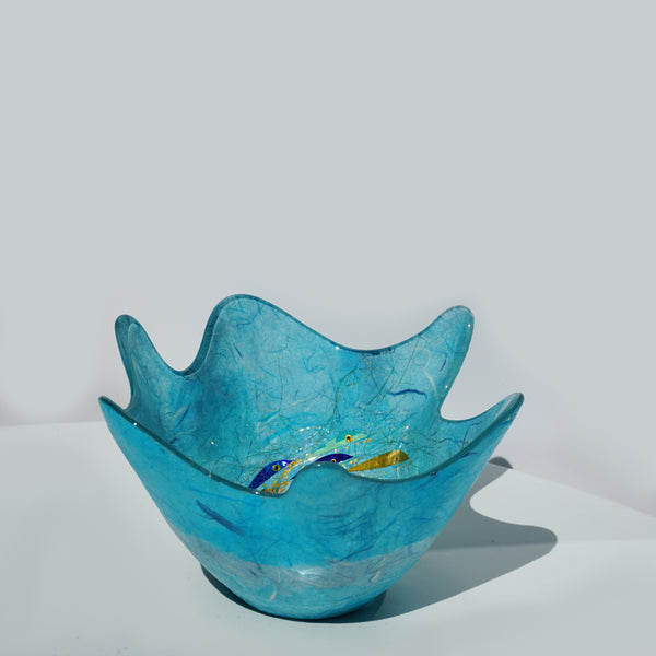 Margaret uses a unique technique involving straw silk fibres to create her beautiful glass bowls, plates, and glowpots, each of which is delicately finished with gold or silver leaf. Her work explores the use of colour, texture, and translucency and her themes include water and fish, which are depicted used handmade papers in a range of colours and patterns. Margaret's designs feature on recycled glass bowls, vessels and glass panels created by her. Each piece is delicately finished, capturing the translucency of water and the bright colours, movement, and shimmers of shoals of fish.