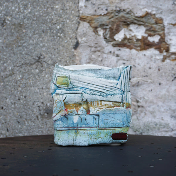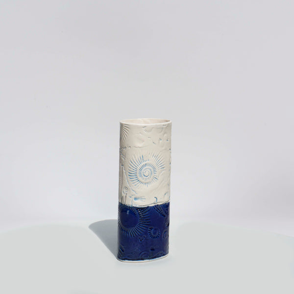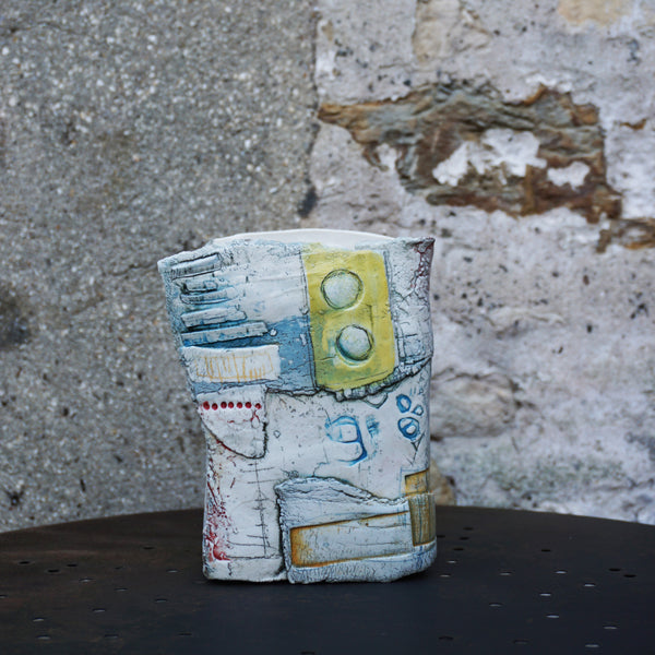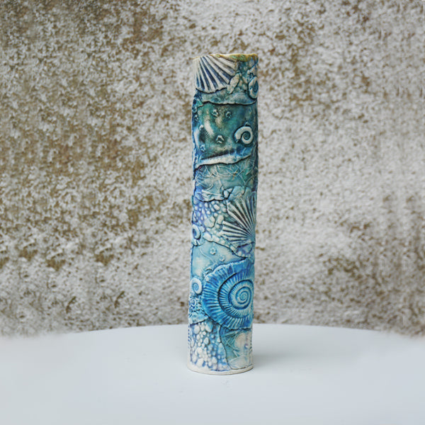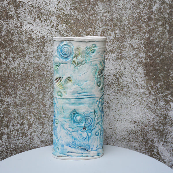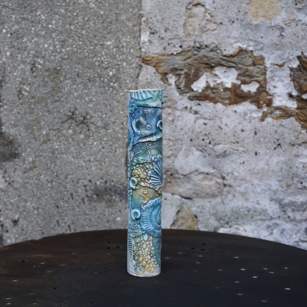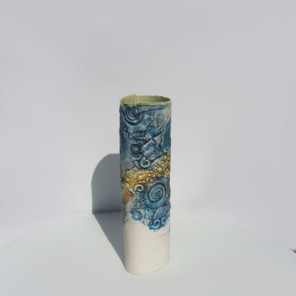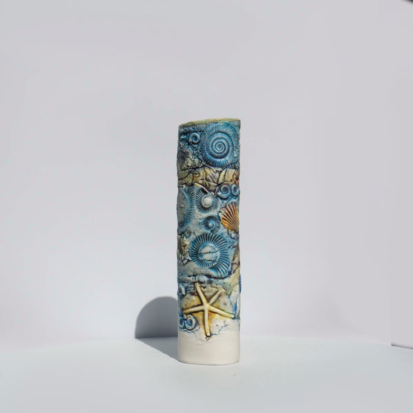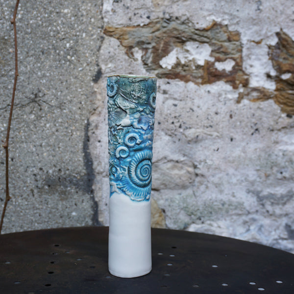 Sarah specialises in hand-made primarily porcelain vessels, inspired by nature, these works are crafted using paper clay. She spends time collecting shells, ammonites and leaves to use in pieces inspired by the sea and coastline. These are used to make plaster moulds to create relief images. The textural work is hand built and then decorated with delicate washes of colours and oxides to heighten the design, whilst some are left plain and rely on sunlight and candle light to shine through their porcelain translucency.