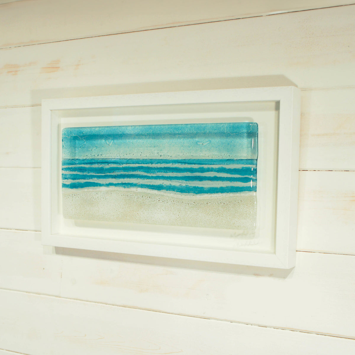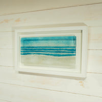 Medium landscape frame showcasing a beach scene with the sea in teal/turquoise, the sand in beige and small low relief seagulls.